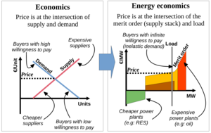 In electricity markets, prices are determined in the same way as in basic economics: at the intersection of supply and demand. Supply is provided by power plants (such as wind, solar, coal, and gas), while demand corresponds to electricity load. Power plants are ranked from lowest to highest production costs—the merit order—and the most expensive plant required to meet demand sets the market price.